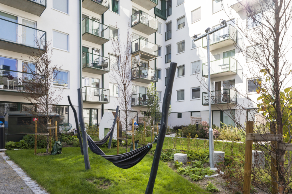 Innergården har plats för umgänge, vila, lek och bus – här finns bland annat kojor och hängmattor. Gården delas med kvartersgrannen SKB.